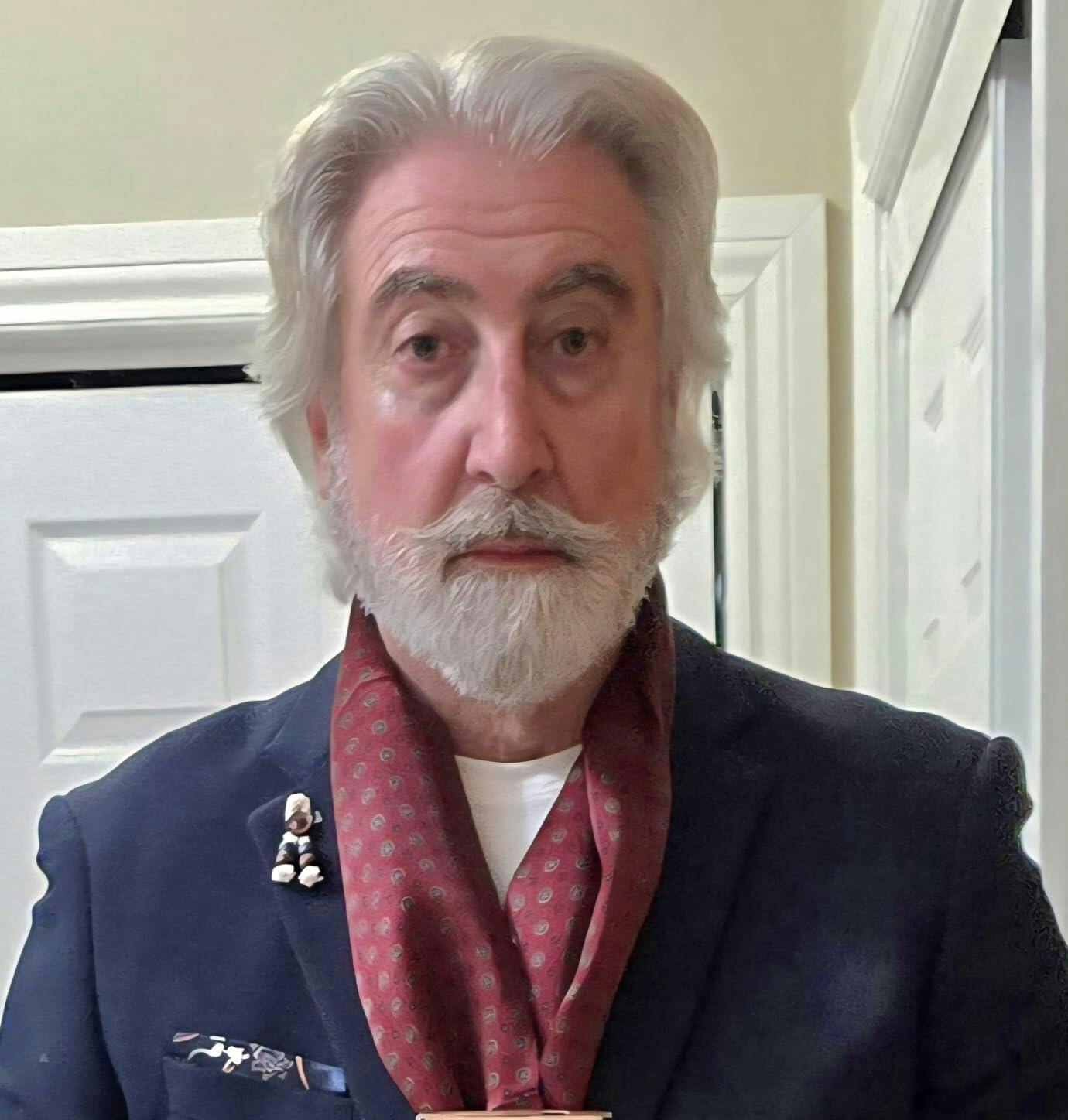 A person in a green suit, adorned with the SusanSilk Geometric Pattern Long Silk Scarf and a red lapel flower.